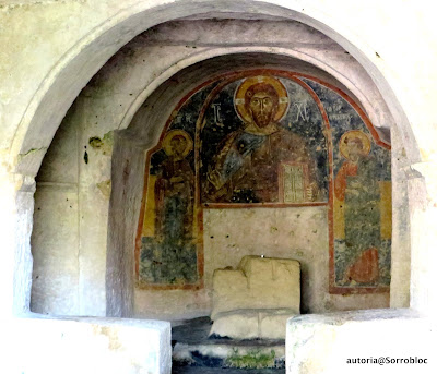 Un cop dins anem observant i fent multitud de fotos dels frescos, encara que alguns comencen a estar una mica deteriorats (no en va alguns daten del seg.XI). La senyora que ens acompanya ens va explicant tant bé com pot qui són cada un dels personatges que trobem representats en les diferents fornícules tot al voltant de les parets de la cova convertida en església rupestre.